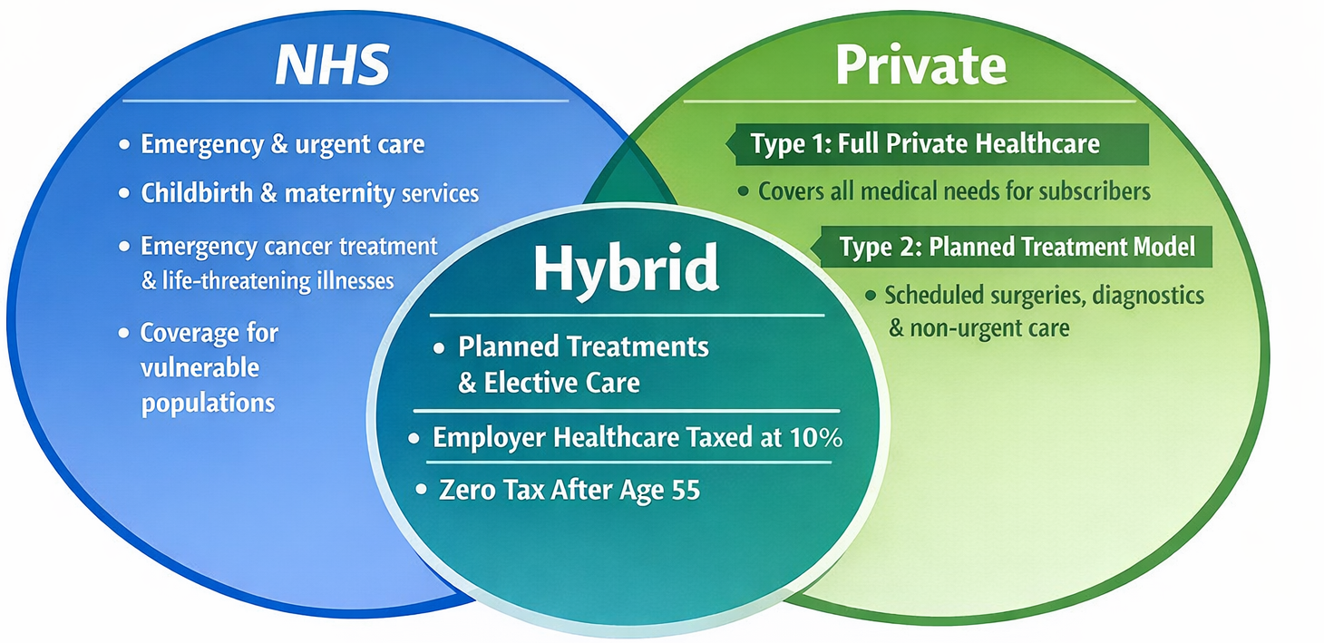 This proposal aims to modernise UK healthcare by shifting routine, non-emergency treatments to private healthcare, while keeping the NHS responsible for emergency care, childbirth, critical illnesses, and supporting vulnerable populations.